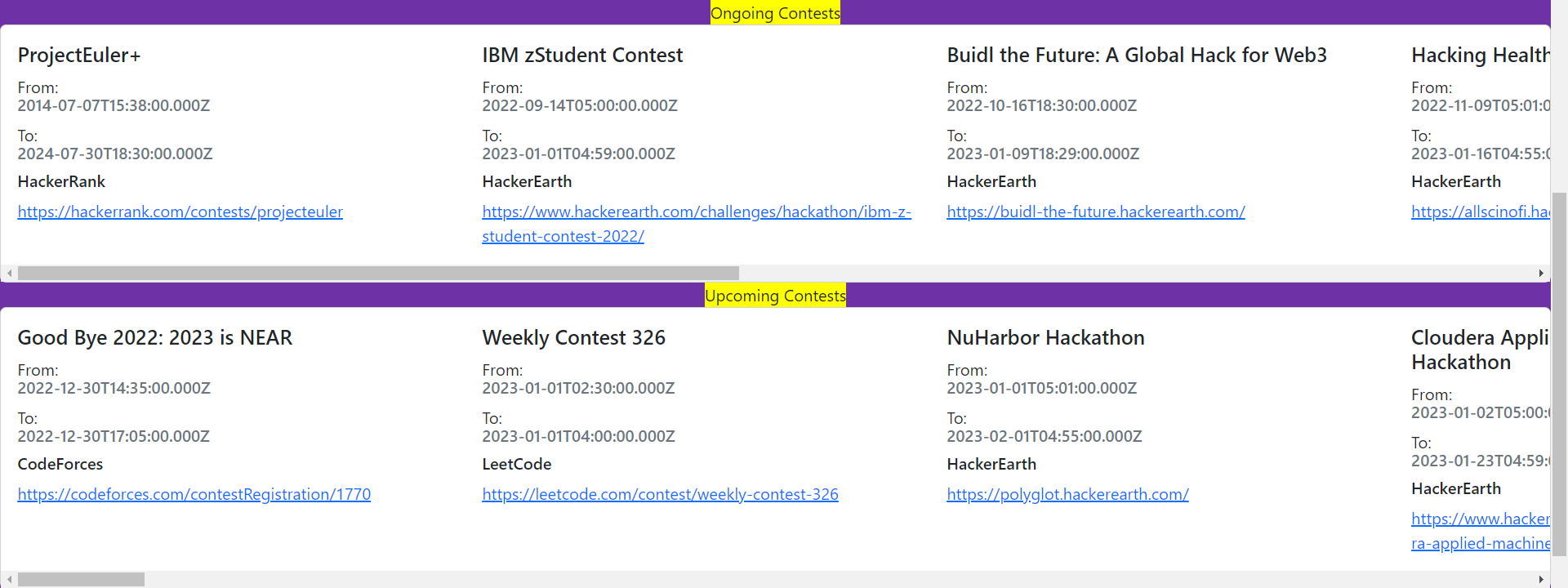 Through Middle Part of website, coders can view details of all(ongoing and upcoming) contests and can be redirect to corresponding coding contest's portal by clicking on contest link.