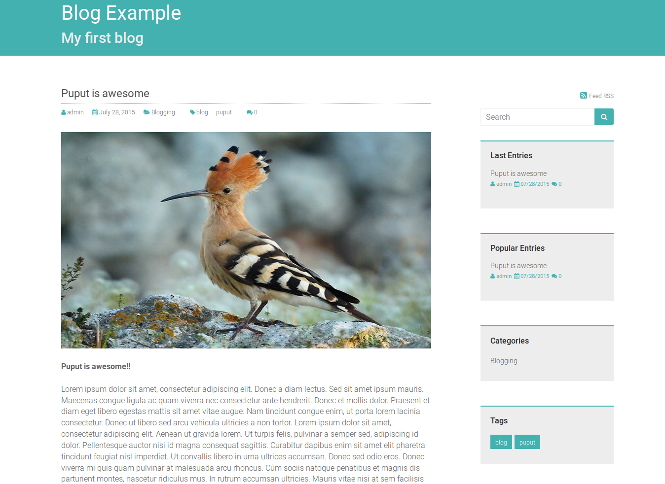 python manage.py migrateandpython manage.py puput_initial_datato load initial data to start a blog site. - Open your broswer at http://127.0.0.1:8000/blog/ to view your blog home page. Go to http://127.0.0.1:8000/blog_admin/ to view the admin site and edit your content.