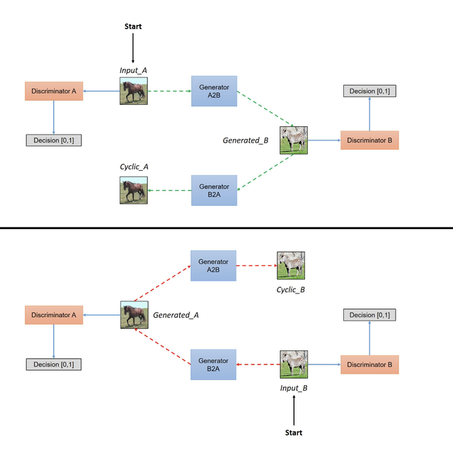 - Domain-B -> Generator-A -> Discriminator-A -> [Real/Fake]