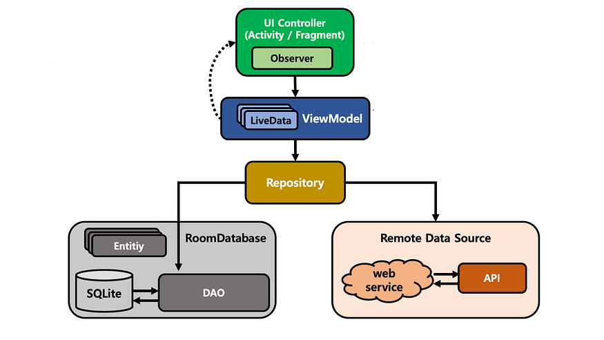 ViewModel: Acts as a communication center between the Repository (data) and the UI. The UI no longer needs to worry about the origin of the data. ViewModel instances survive Activity/Fragment recreation.