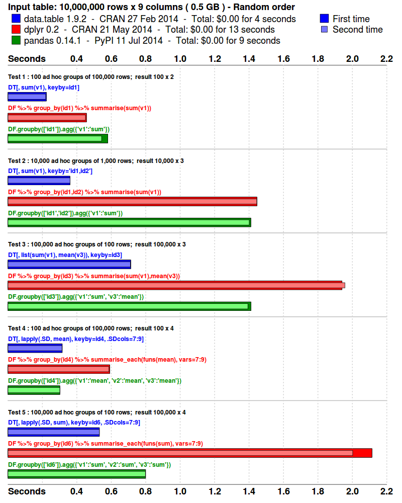 timeit.Timer("DF.groupby(['id6']).agg({'v1':'sum', 'v2':'sum', 'v3':'sum'})" ,"from __main__ import DF").timeit(1)$ R --vanilla