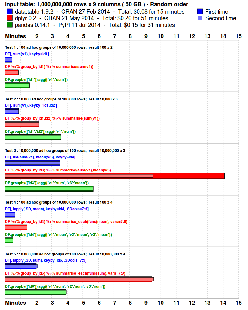 This would be great to investigate. Any volunteers? The time and space to create indexes vs the subsequent faster grouping times should be reported separately. data.table's setkey is like a clustered index in SQL. The key is the physical row order in RAM and is very L2/L3 cache efficient when grouping those columns. dplyr would also be faster on a data.frame if the groups are contiguous in RAM for the same reason. But recall that the benchmark's 5 queries are designed to test grouping in several different columns. So just one ordering or one index would be insufficient. This is why we're working on secondary keys (set2key) analogous to CREATE INDEX in SQL. Two types of SQL database should be tested: row-store and column-store. If they have in-memory options those should be selected since disk will always be slower than RAM. Both data.table and data.frame are in-memory column stores limited by RAM. 240GB is the biggest EC2 machine available currently which we used for these results. On the other hand, a database can of course can store and query many TB and the data can persist on disk.