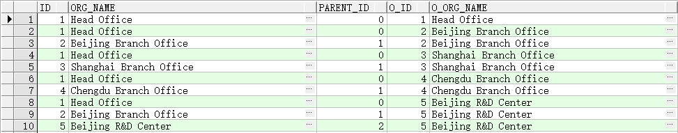 ID,ORG_NAME,PARENT_ID,ID O_ID,ORG_NAME O_ORG_NAME