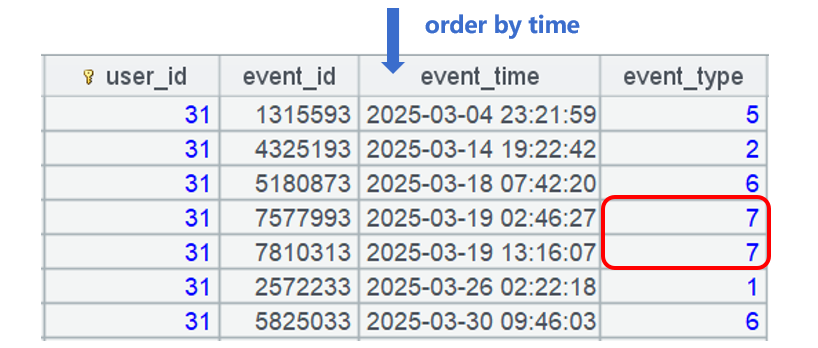 For a same user, an event – when compared with the preceding one – that happens in chronological order and has the same event_type value are the duplicate one. For example, user 31 has an event whose type is 7, the directly next event whose type is also 7 is a duplicate: