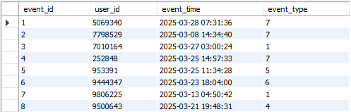 Take event table (events) as an example. It has data as follows:
