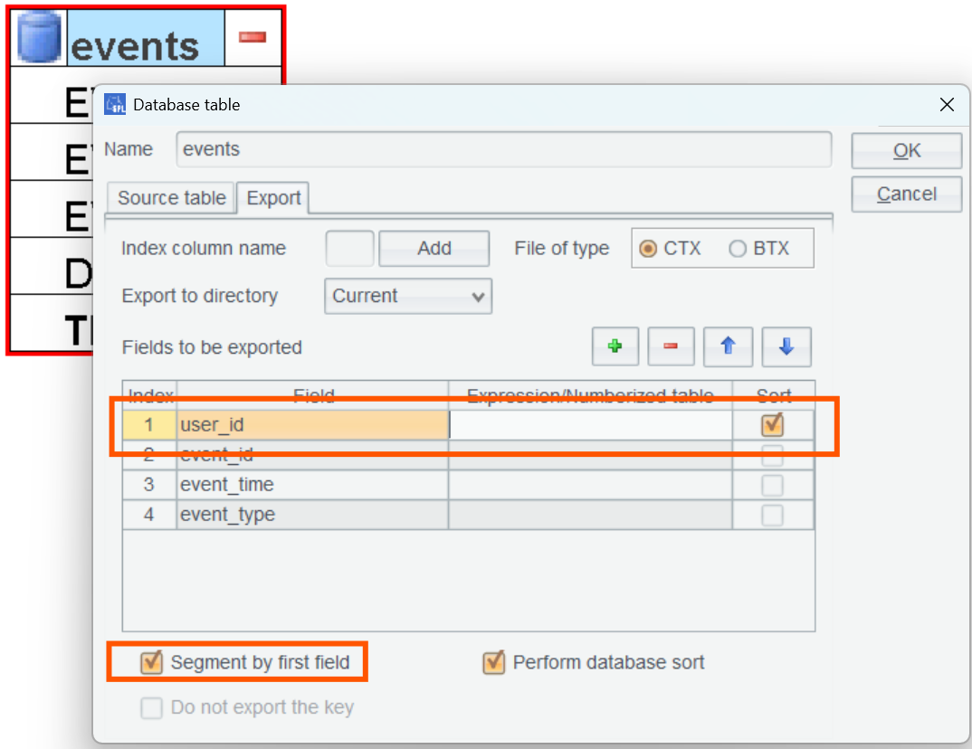As user_id values are not unique, option “Segment by first field” should be checked, meaning the first field will be the segmentation field.