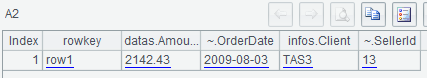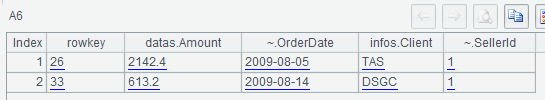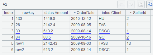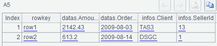 | 3 | =hbase_get(A1,"Orders","row1","datas:Amount":number:amt,"datas:OrderDate":od) |