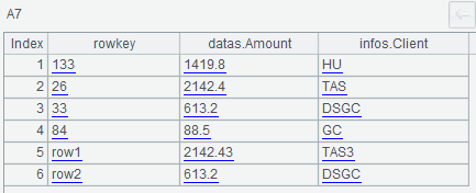| 6 | =hbase_scan(A1,"Orders";startRow:2,stopRow:4) |