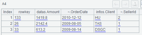 A3 queries the Amount and OrderDate columns of the “datas” family and specifies the data type as number and date. The columns in the result also have alias as amt and od: