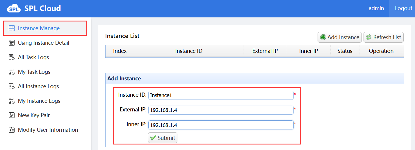 Here we log in as the admin (Default password for admin is 88888888), enter the QVA administration page, click “Instance Manage” and add an instance. You can click “Refresh List” button to view operation status of the instance: