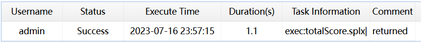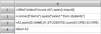 | 2 | =A1.exec@x("slntest1/totalScore.splx",100) | //Execute totalScore.splx in storage bucket slntest1, and get the return value |