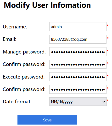 Execute password: Execution password; used to configure QVA password in qvsConfig.xml