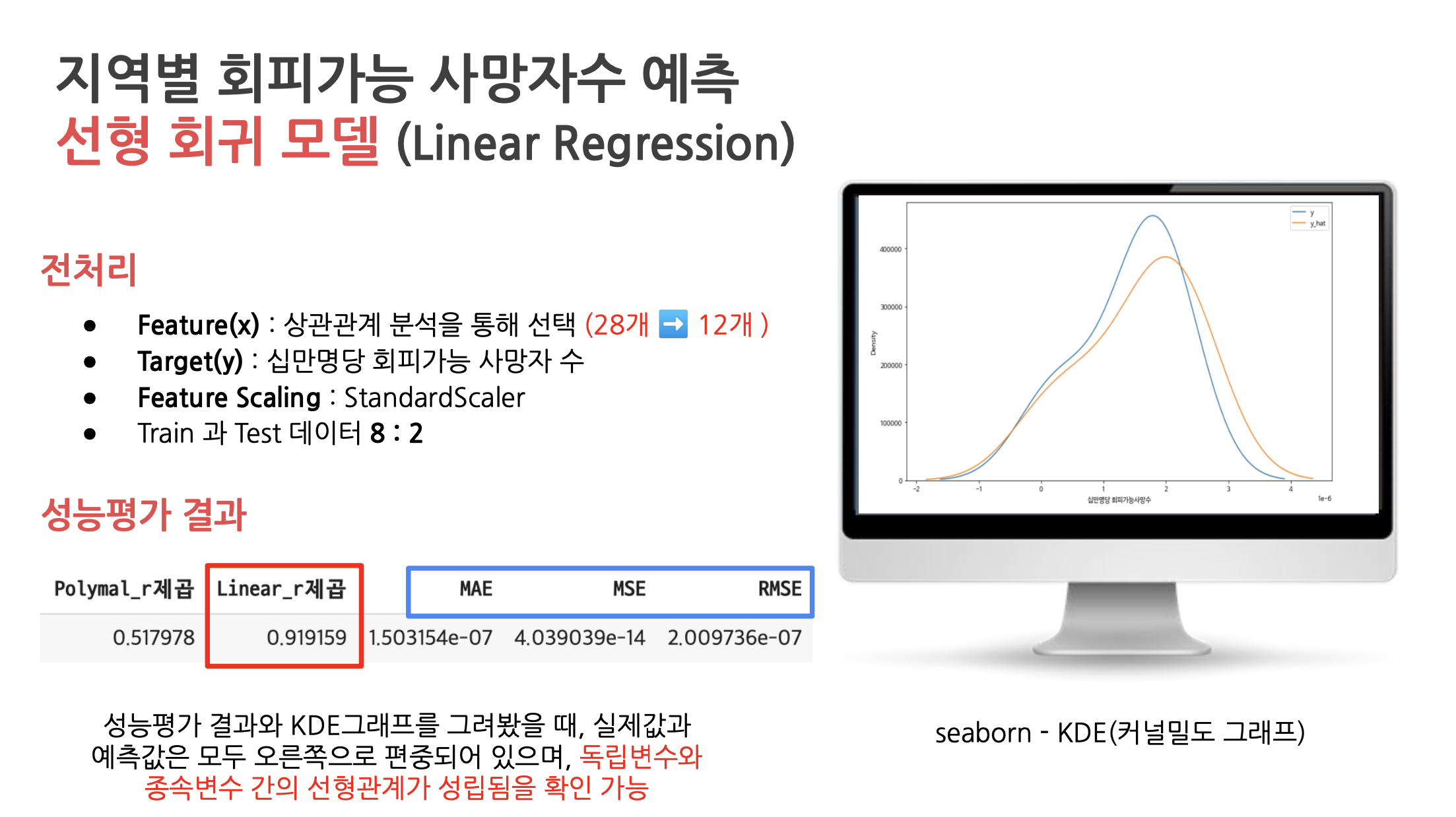 👉종속변수인 ‘회피가능사망수’와 여러 개의 독립변수를 선형 회귀 분석으로 모델링 후 R2값 0.91을 기록하며 높은 정확도의 예측 모델을 개발