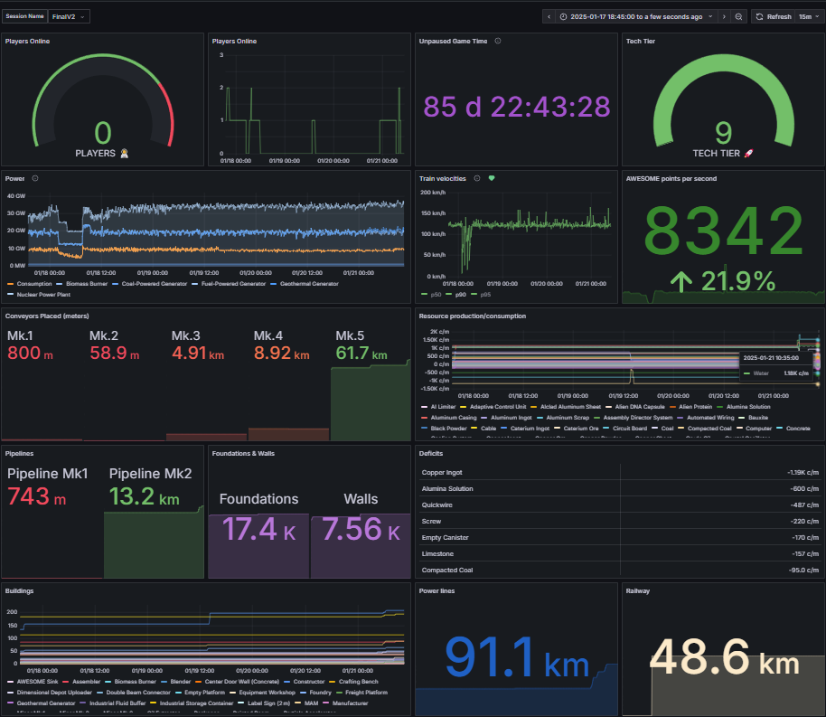 npm run dev /mnt/c/Users/potato/AppData/Local/FactoryGame/Saved/SaveGames/grafana.json contains a dashboard configuration for metrics using this exporter in tandem with Shinigami92/satisfactory-server-prometheus-exporter