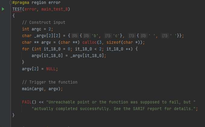 UnitTestBot C/C++ displays the test run results near the test headers. The green signs mark the passing tests, while the red ones mark the failing tests.