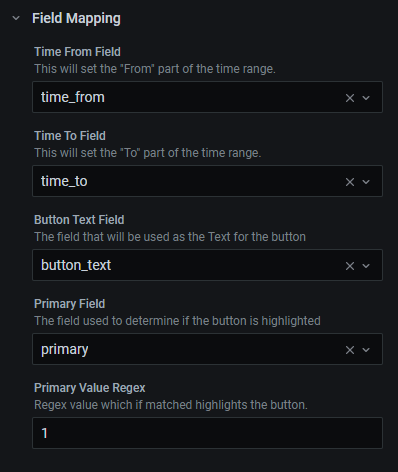 | Time From Field | time_from | Required A UNIX Timestamp ( Number) or ISO 8601 formatted dateThis will set the "From" part of the time range. The value can include or exclude ms. Example: 1612413008000 or 1612413008 |