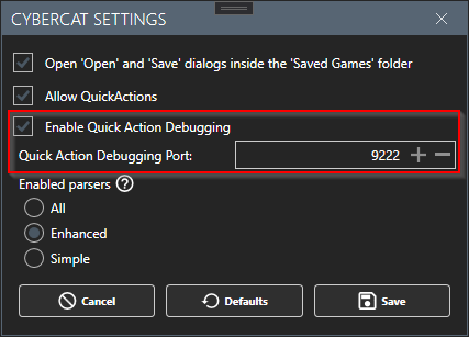 To debug QuickActions open the settings window and check "Enable Quick Action Debugging" and set the "Quick Action Debugging Port" Default is 9222: