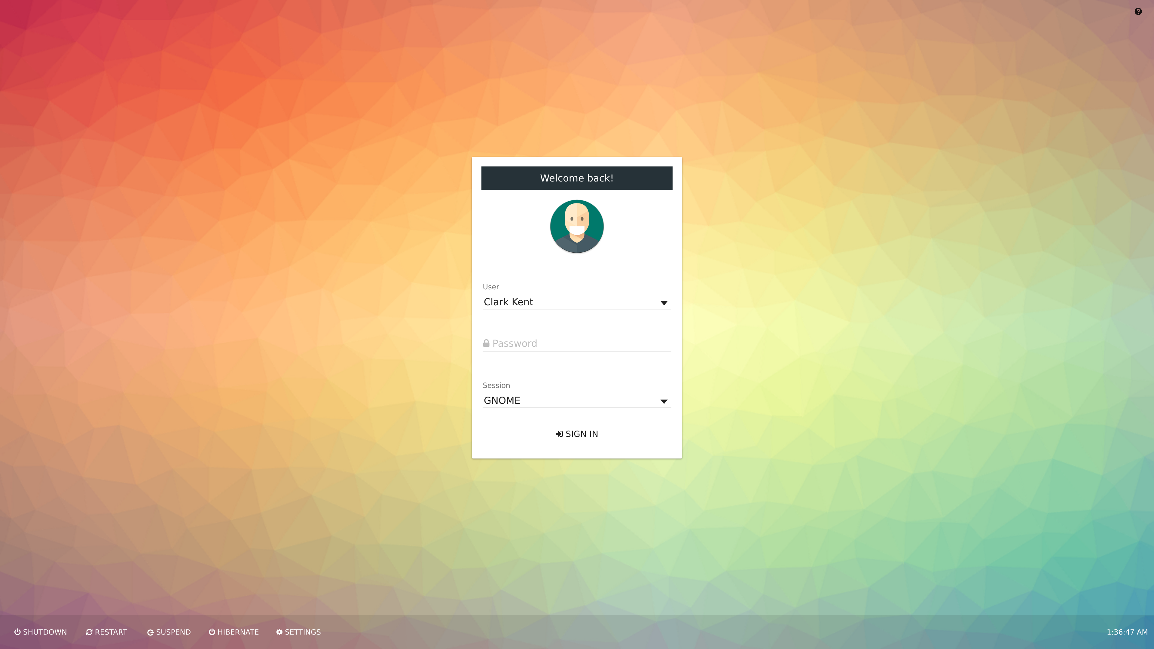 - Select session (GNOME, KDE, Xfce or other installed DE)