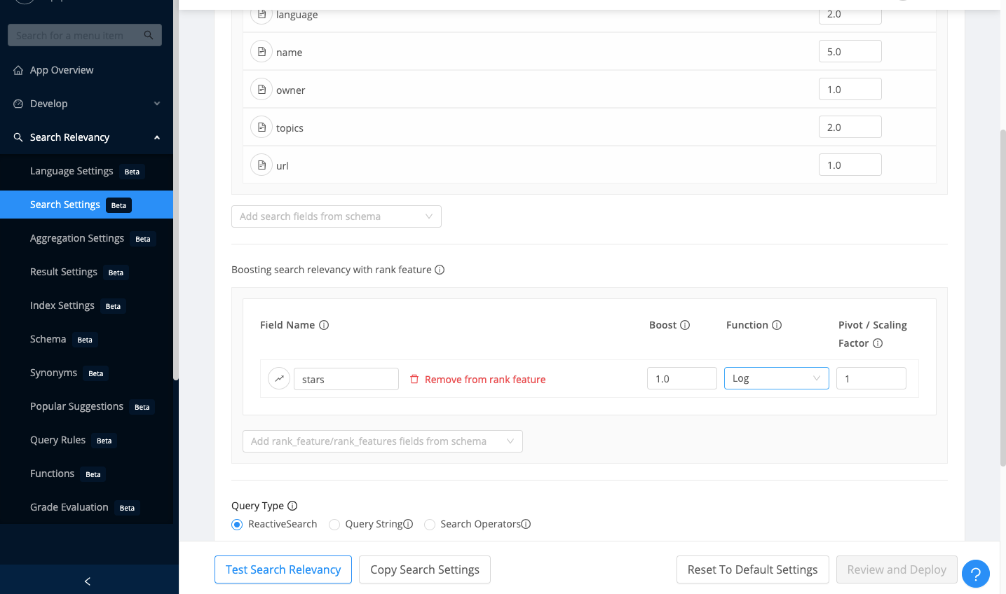 The Search Settings section of the appbase.io dashboard also allows one to configure the searchable fields and weights. Setting these through the dashboard has the advantage of not having to set these values through code — thus allowing for easy experimentation and relevance optimization in real-time without requiring code deploys.