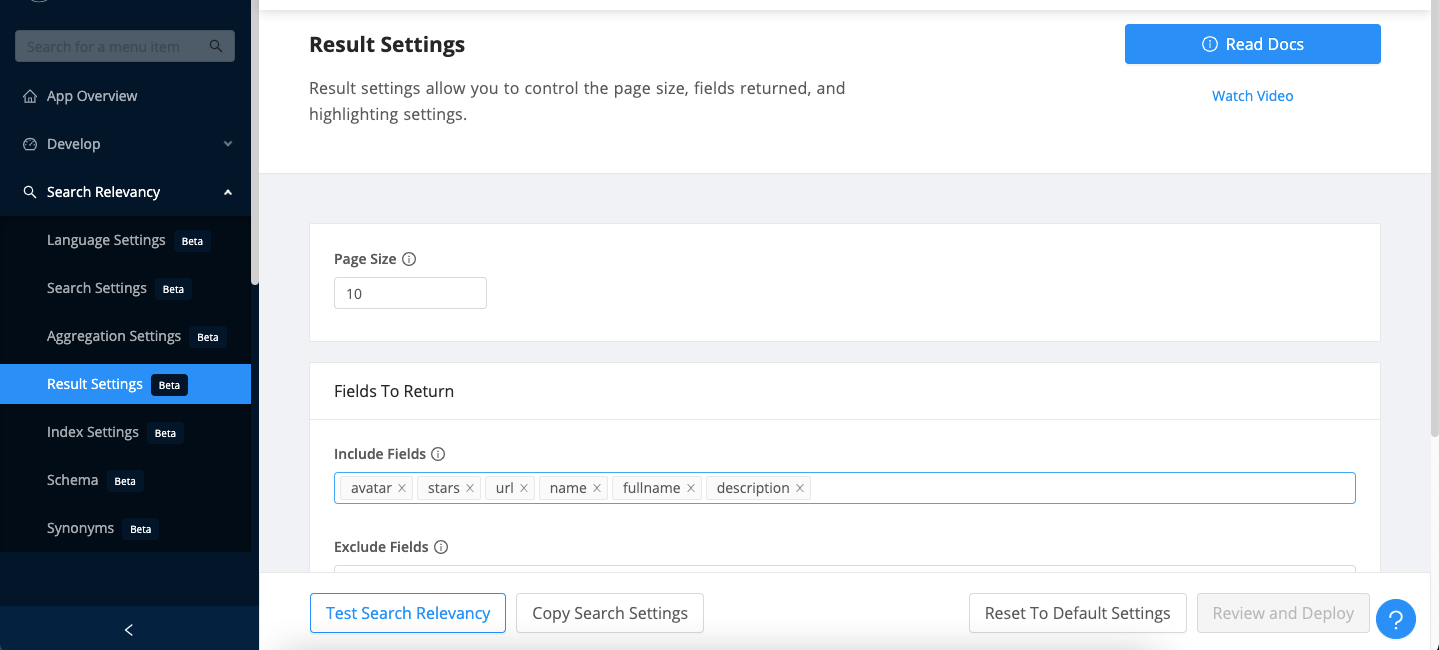 So far, we have gone through everything that’s needed to build a search interface. However, to make our search experience production-grade — we will make some tweaks below to set search relevance and result settings via appbase.io’s control plane instead of having them set via FE code. Setting them via a control plane allows one to tweak search relevance independently of the search interface changes.