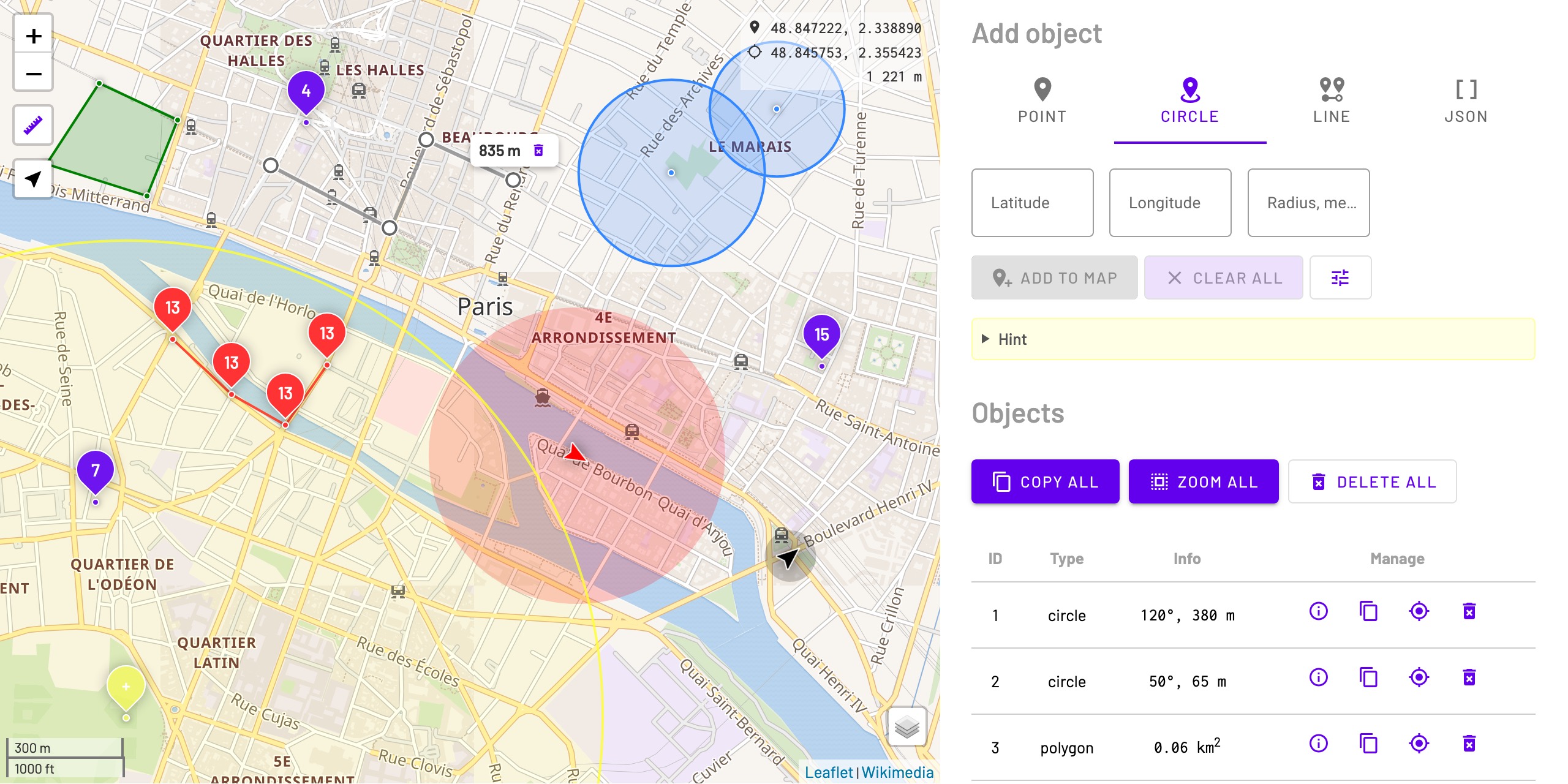 ]Example with all required parameters (type, coords, radius) and some optional (RGBA color, showMarkerPin):