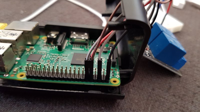 - Connect up the (black) 5v output GPIO pin 2 wire to the VCC on the relay