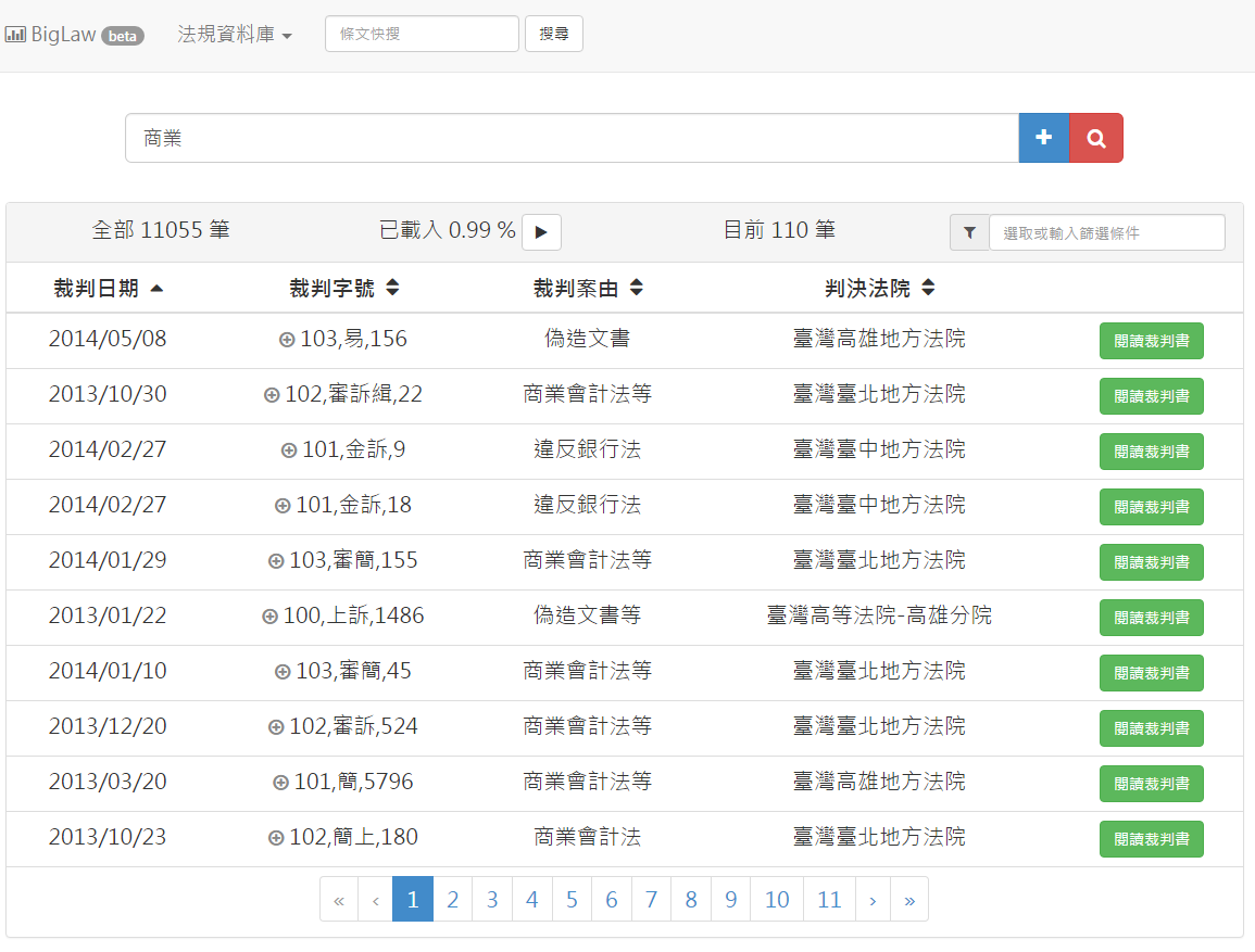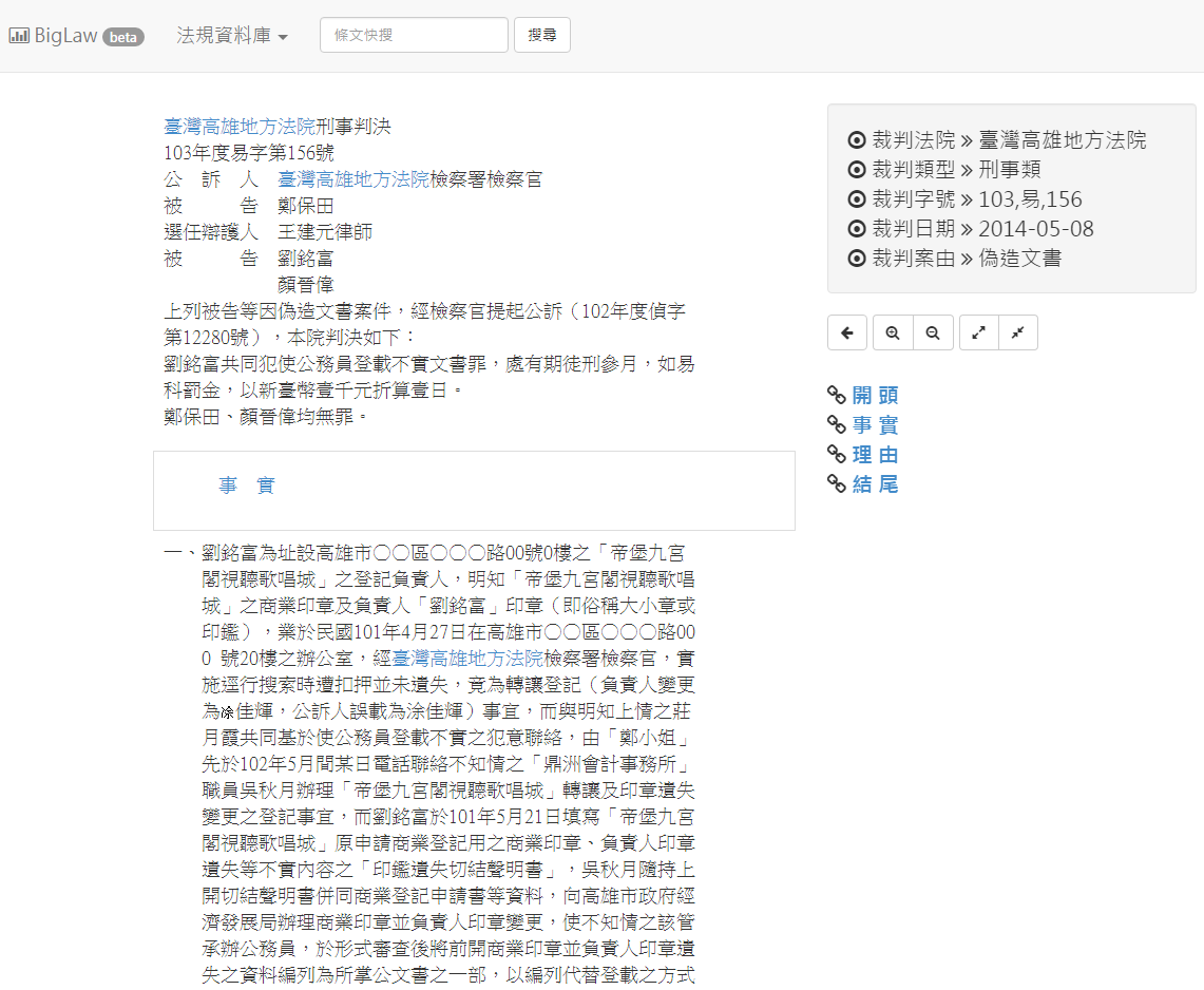 BigLaw - 開放法律判決智慧檢索與分析應用 這是一個開放的法律判決搜尋網站 因為司法院法學資料檢索系統並不是很好用 因此我們想辦法將資料爬下來並且整理 自己製作圖表與使用搜尋引擎提供檢索 因為架構有點複雜而且程式碼有點混亂 因此目前此 repo 還是舊版 還請不要使用! 重新整理好就會推上,敬請期待!