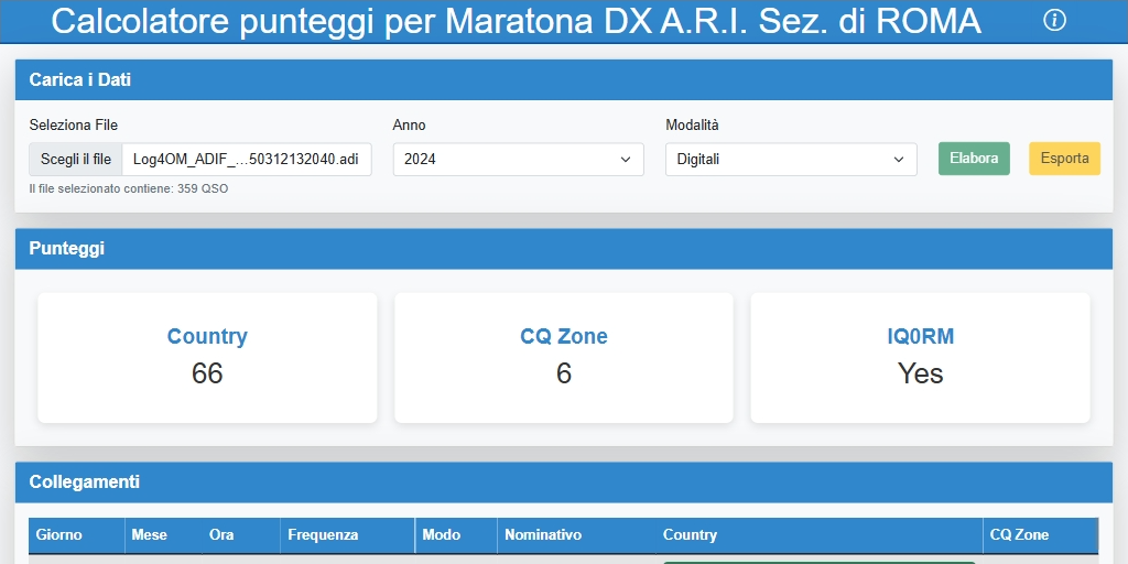 Questa applicazione permette di semplificare il calcolo dei punteggi partendo da un file ADIF, l'obbiettivo finale è quello di generare un elenco dei collegamenti utili alla partecipazione della Maratona, al fine di semplificare la compilazione del modulo di participazione.