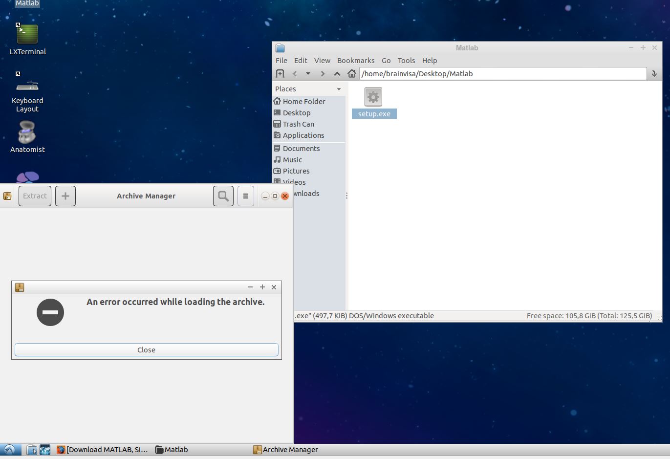We're not experts of Matlab, so we may not be able to help you efficiently. Are you actually trying to install a Linux version of Matlab ? I'm asking because I see ".exe" which is usually a Windows executable extension. Just to be clear, the BrainVisa Virtualbox container is a Linux system, so you need to install Linux programs in it.