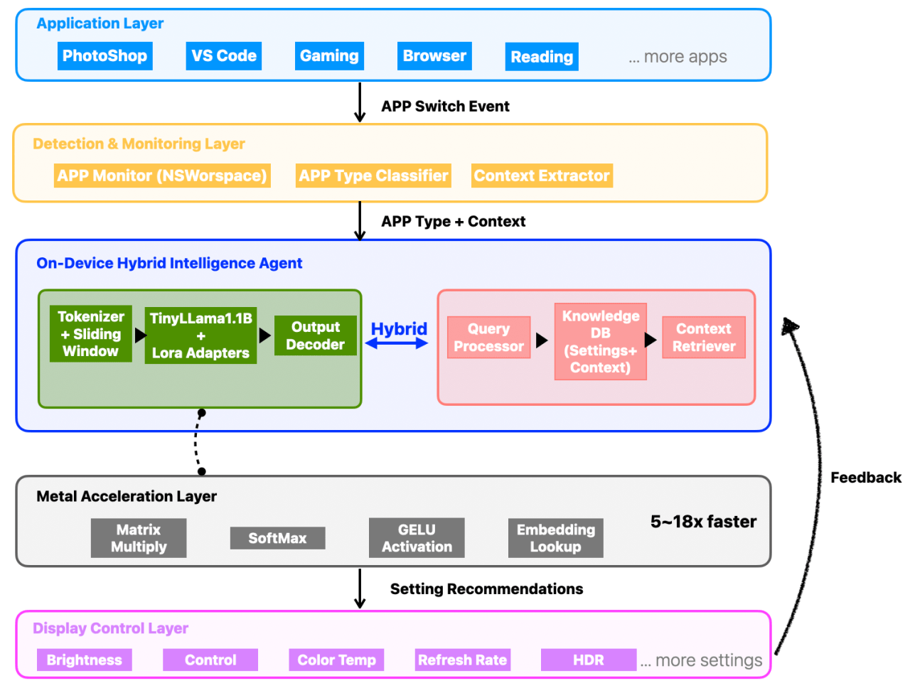 The system achieves 92% accuracy with CoreML acceleration delivering 21.3 tokens/second on M3 Pro (7.89× speedup), enabling sub-second responses. Our LoRA fine-tuned TinyLlama 1.1B proves hybrid approaches superior for responsive, context-aware optimization without cloud dependencies. The pdf paper can be found in this link:(https://dqzheng.com/wp-content/uploads/2025/10/On-deviceAgentforDisplay.pdf)