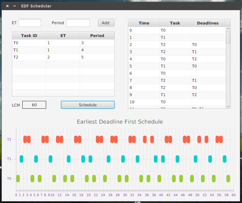 Earliest-Deadline-First scheduling GUI representation of the Erliest Deadline First CPU task scheduling