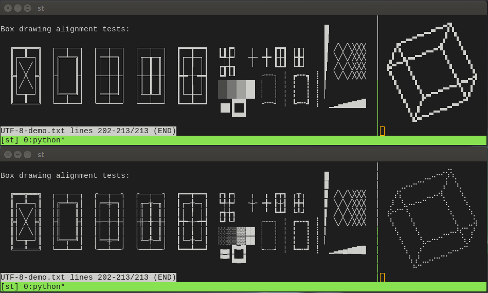 ex. powerline:  ex. lcarsline:  ex. boxdraw: https://st.suckless.org/patches/boxdraw/