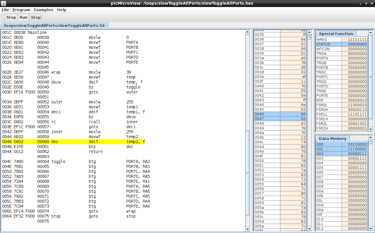 **New in version 0.7: 1. Integrated view of program memory, data memory, and .lst file, with program memory and specific line in .lst file highlighted with current instruction when stepping. 2. Separate Ports/Registers table showing Special Function Registers. 3. Ports/Registers table and Data Memory table highlight which addresses were written to by previous instruction when in step mode. 4. Commented examples of many instructions along with general concepts such as indirect addressing and assembly language loops. 5. Ports A through E update Ports/Registers table in real time as program runs. 6. Indirect addressing with INDF, PLUSW, POSTDEC, POSTINC, PREINC. 7. Banked addressing with BSR. More instructions and features on the way with next release around April 1.