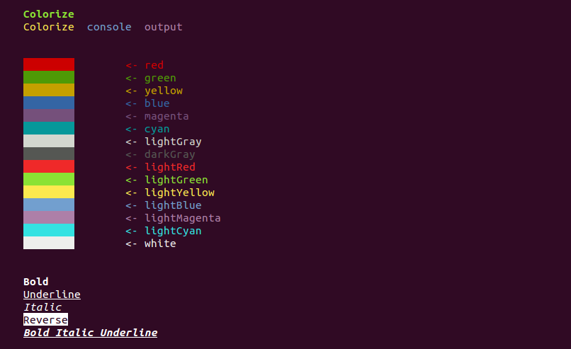 color("Bold Italic Underline", front: Styles.RED, isBold: true, isItalic: true, isUnderline: true);Enum Styles contains all styles which you can pass to Colorize.applyState method;