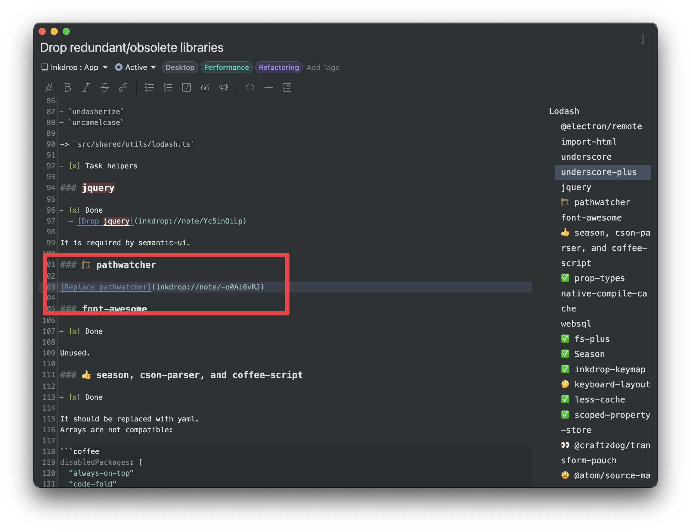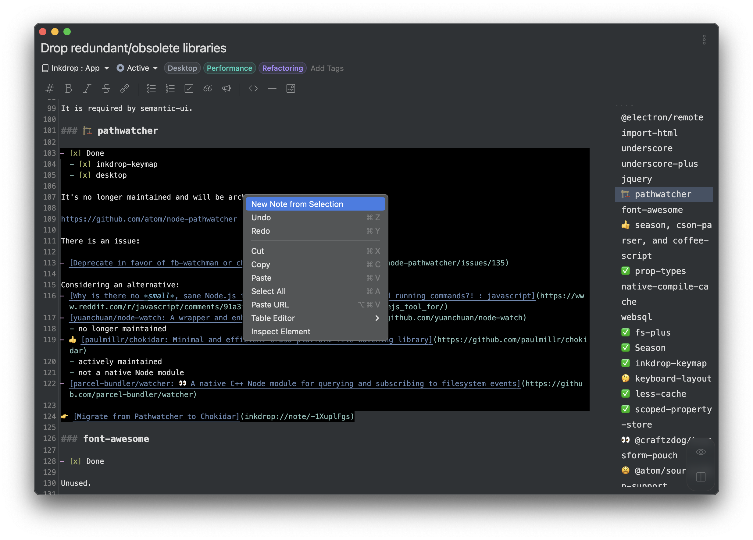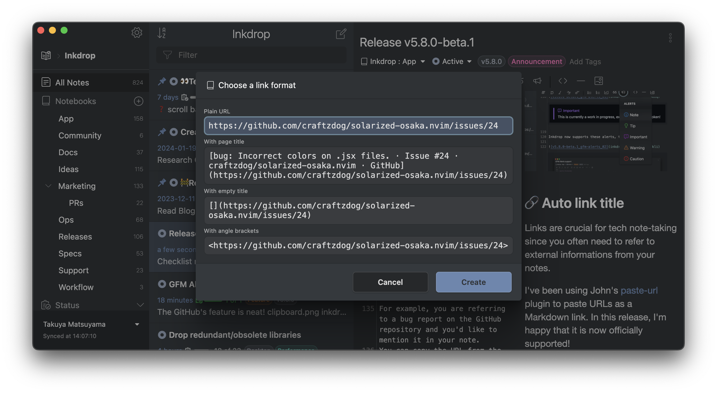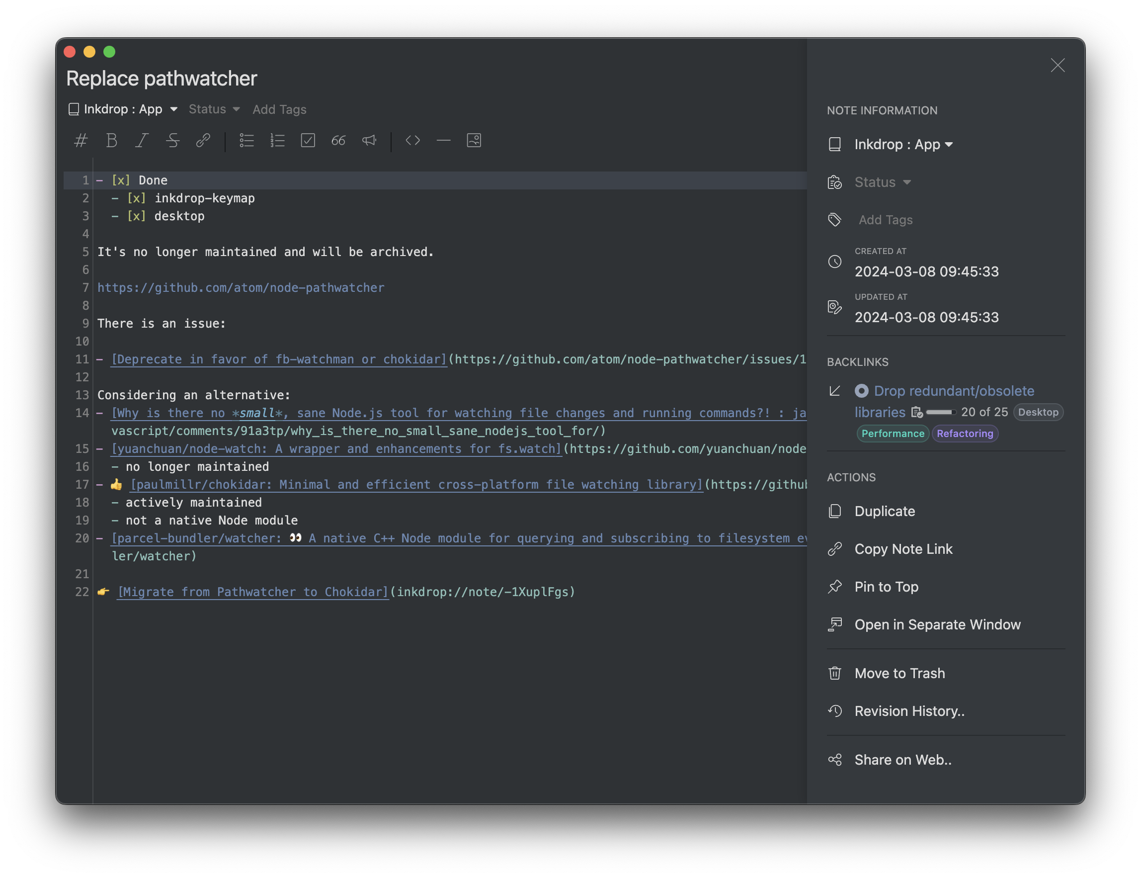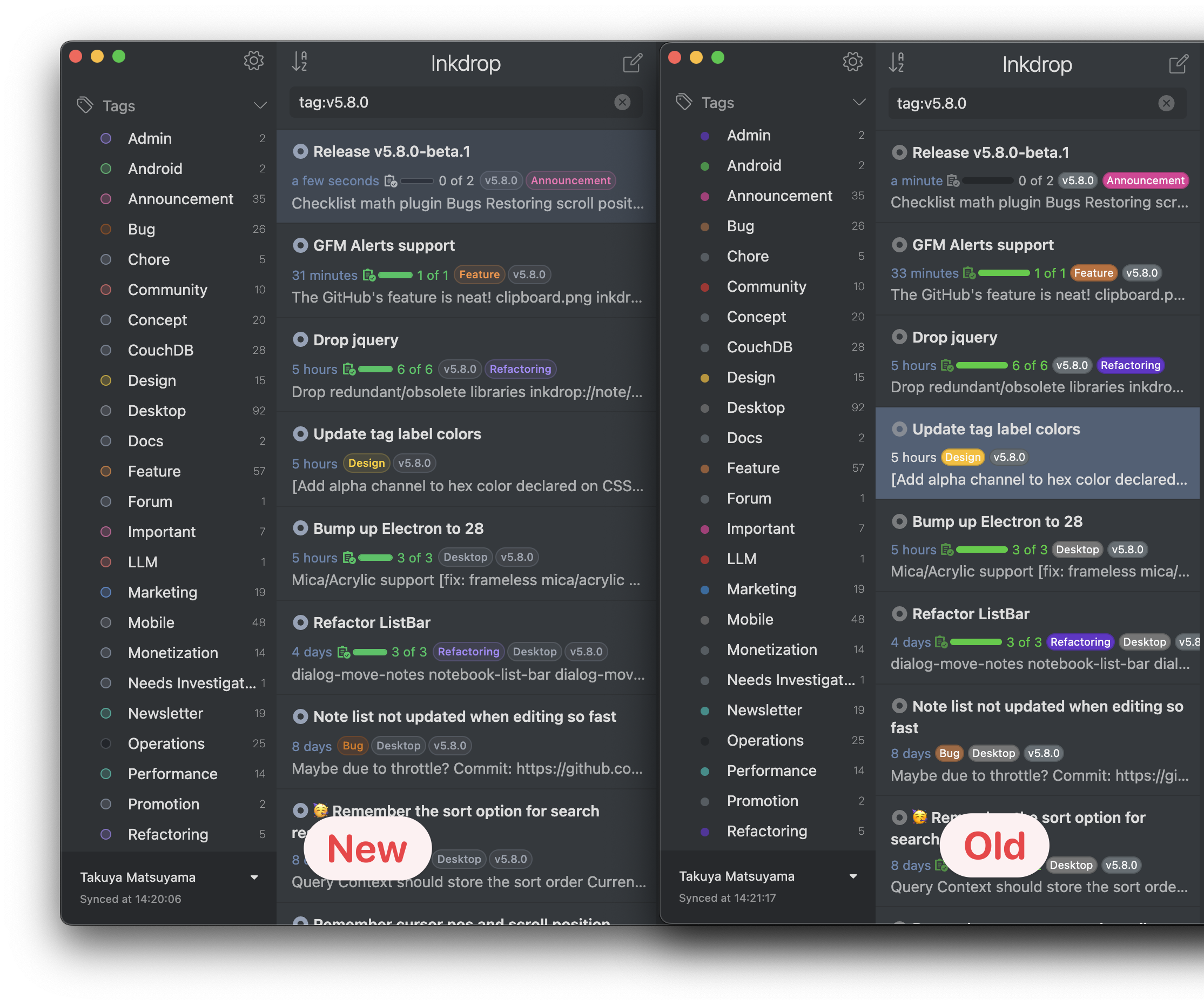 Inkdrop sometimes automatically resolves note conflicts but it could cause unwanted results in some cases. In this update, it provides a dedicated UI for resolving the note conflicts. You can view conflicted revisions in a separate window respectively to manually resolve the conflicts, which would prevent losing your edits. It will be also supported in the mobile version.