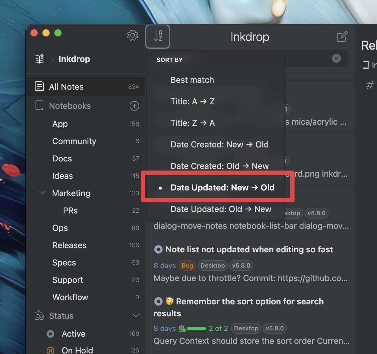 In previous versions, the note sort order was automatically switched to 'Best Match' when searching with keywords. It turns out that some people prefer sorting by Last Updated or other criteria. I realized that I sometimes do so, too.