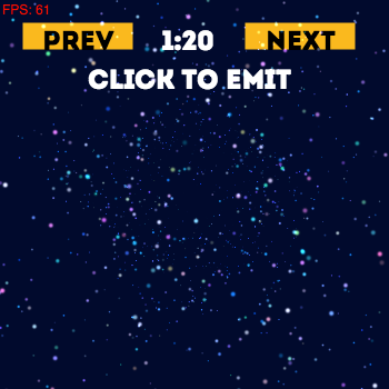 ps.emit(stage.stageWidth / 2, stage.stageHeight / 2);See minimal example under samples/minimal for more info.