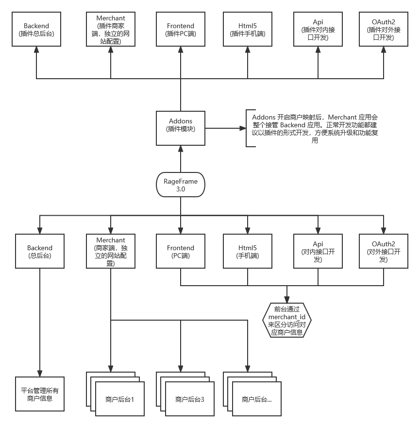 - 多入口模式,多入口分为 Backend (后台)、Merchant (商户端)、Frontend (PC前端)、Html5 (手机端)、Console (控制台)、Api (对内接口)、OAuth2 Server (对外接口),不同的业务,不同的设备,进入不同的入口。