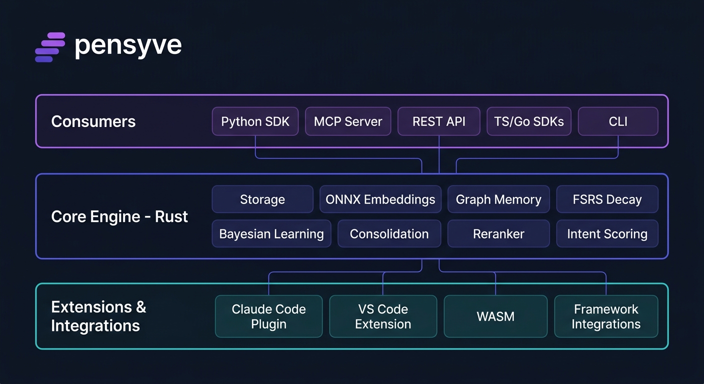 | Need to scale to production | Postgres backend — feature-gated pgvector for multi-node deployments. Managed service at pensyve.com. |