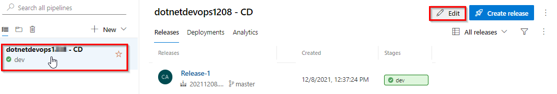 The Azure DevOps project created a release pipeline to manage deployments to Azure.