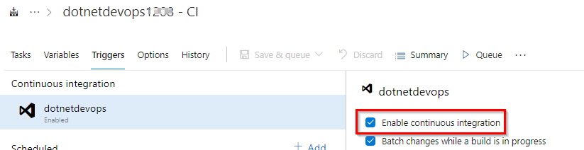 2. Select Triggers. The Azure DevOps project automatically created a CI trigger and every commit to the repository initiates a new build. You can optionally choose to include or exclude branches from the CI process.