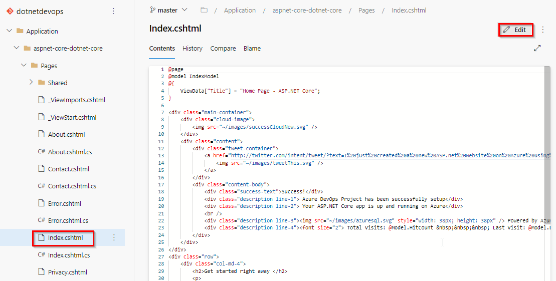 3. On the left-hand side of the browser, navigate to the Application/aspnet-core-dotnet-core/Pages/Index.cshtml file. Select Edit, and make a change.