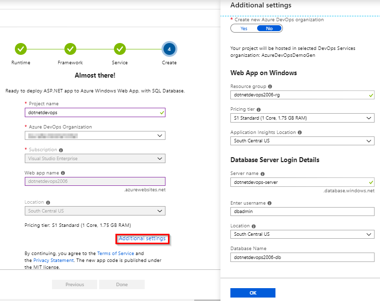 7. Select your Azure DevOps organization and choose a name for your project and Web app. When you’re done, choose Review + Create.