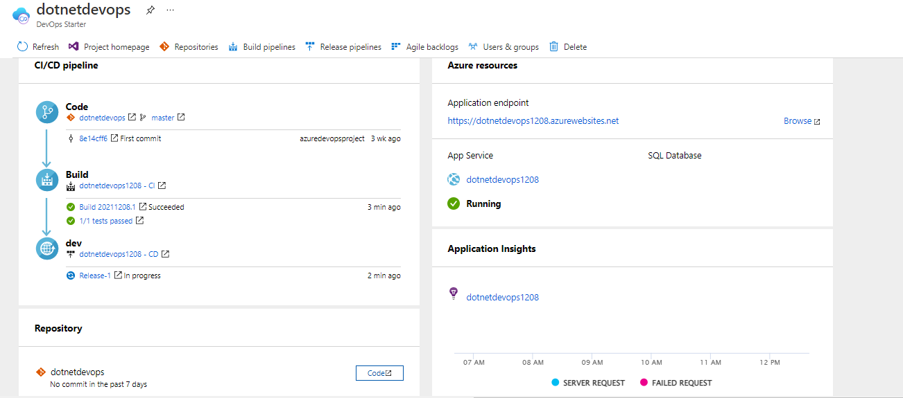The Azure DevOps Starter project automatically configured a full CI/CD pipeline in your Azure DevOps organization. You can explore and customize the pipeline as needed. Follow the steps below to familiarize yourself with the Azure DevOps build and release pipelines.