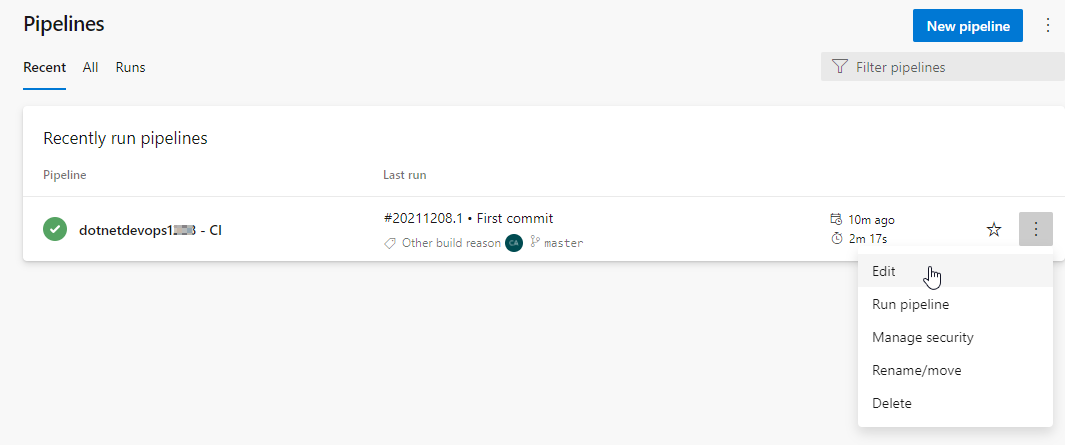 3. In this pane, you can examine the various tasks for your build pipeline. This build pipeline performs various tasks such as fetching sources from the Git repository, restoring dependencies, compile the application, run tests and publishing outputs used for deployments.