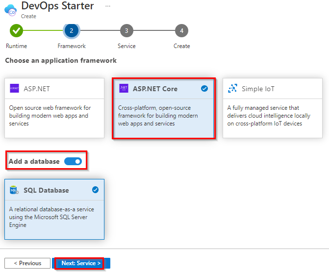 5. The .NET samples include a choice of either the open source ASP.NET framework or the cross-platform .NET Core framework. Select the .NET Core application framework. This sample is an ASP.NET Core MVC application. And also enable Add a database toggle to add the database to the application. When you’re done, choose Next.