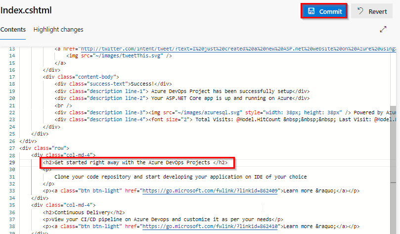 Make a change to the h2 heading. For example, type Get started right away with the Azure DevOps Projects or make some other change. Choose Commit, to save and check-in your changes.