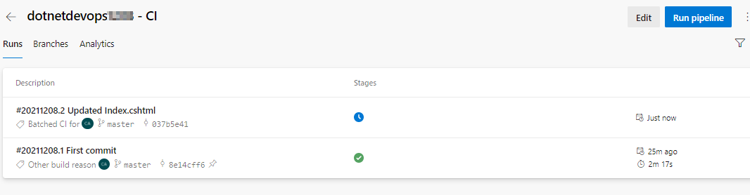4. In your browser, navigate to the Pipelines | Pipelines. You should now see a build is in progress. The changes you just made are automatically built and deployed via Azure DevOps CI/CD pipelines.