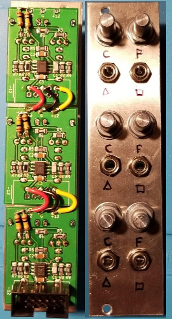Notes: This is shrunk down to be a 1u module. There are power chain jumpers so that you can put 3 of them in a standard 3u tall panel with only one eurorack pwr connector, or you could build 1 and put it in a 1u tile. Pots are super close together, so the max knob size you can put on them is 13mm diameter. Davies 1900H clones from thonk or modular addict (or wherever) will be ok.