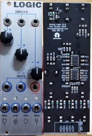 Notes: I'm excited about this one. It's my first real honest to god module design! 3 input attenuverting mixer that goes into analog AND, OR, an averager, and a comparator. You can use the attenuverters alone by plugging into the first row of jacks. This removes the corresponding signal from the logic section. Input 3 is normalled to +10V so it's attenuverter acts as the cutoff control if you don't plug anything into that jack.
